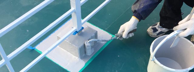 防水材としてFRP(繊維強化プラスチック)を使用した防水工事です。防水層は軽量なのに強靭、さらに耐熱性・耐食性・耐候性などに優れているという特長があります。